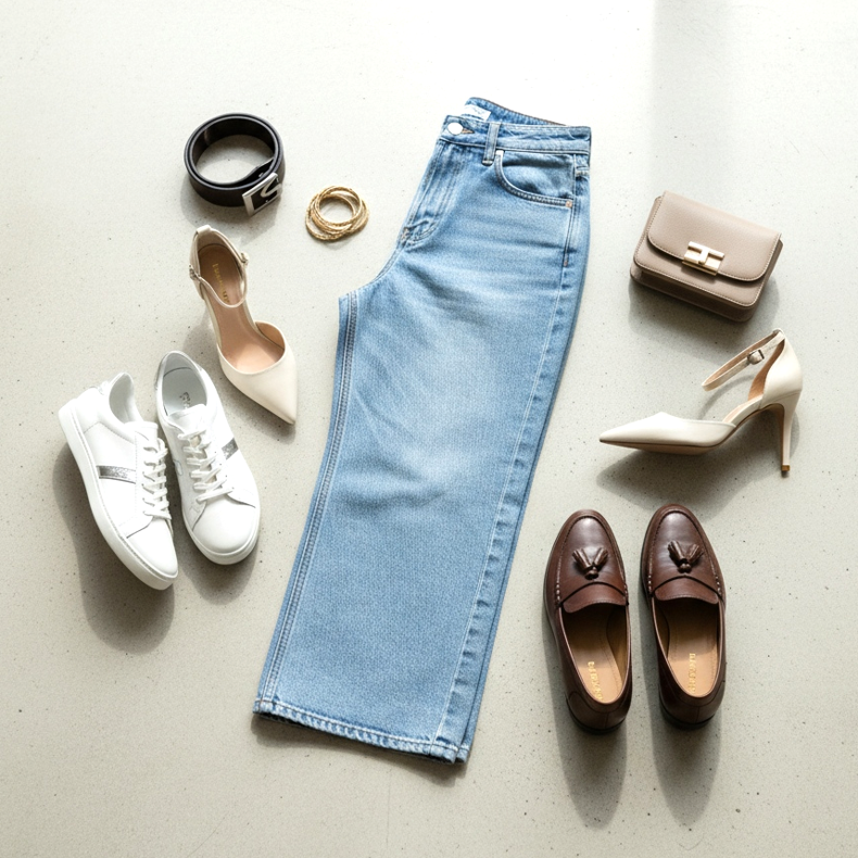 Do szerokich džinsów świetnie pasują buty na wyższym obcasie: szpilki, słupek, koturna. Obcas wyciąga sylwetkę i zapobiega efektowi przeciążonej dolnej części. Loafersy na platformie lub masywne półbuty również świetnie balansują szeroką nogawkę — masywność buta odpowiada ciężarowi spodni.