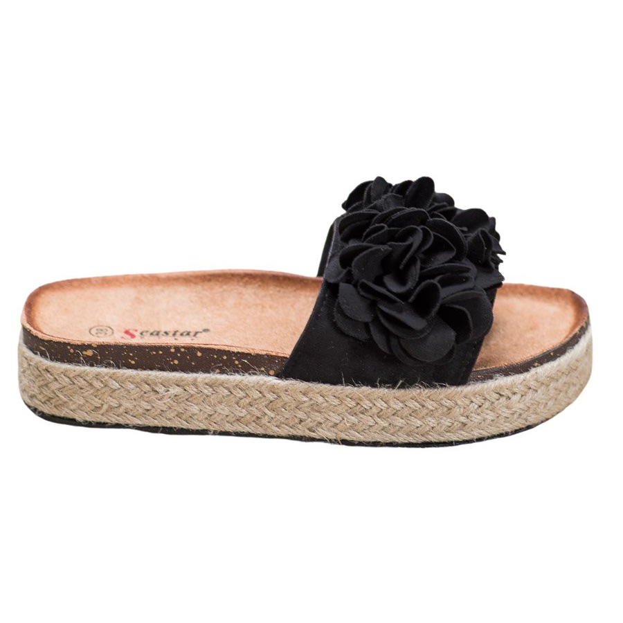 Klapki Seastar wyróżniają się efektownym czarnym kolorem oraz materiałem zewnętrznym z wysokiej jakości ekologicznej skóry zamszowej, która zapewnia elegancki wygląd i świetne dopasowanie do każdej stylizacji. Otwarte zapięcie i brak noska sprawiają, że stopy swobodnie oddychają, co jest szczególnie istotne w gorące dni.