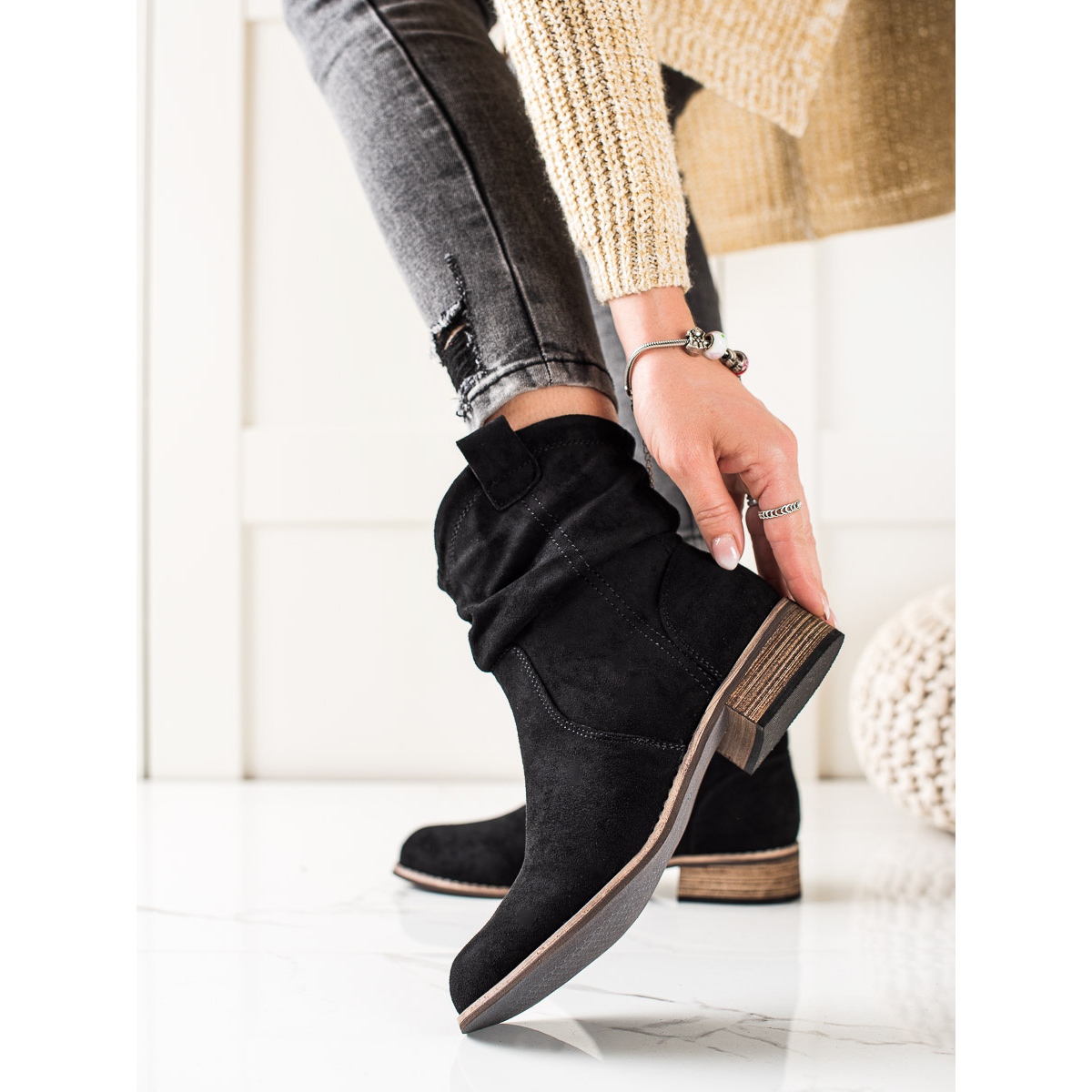 Wysokość cholewki wynosi 15 cm, co sprawia, że buty sięgają za kostkę, dobrze chroniąc stopy przed zimnem. Wykonane z ekologicznej skóry zamszowej, posiadają okrągły nosek, co dodaje im subtelności.