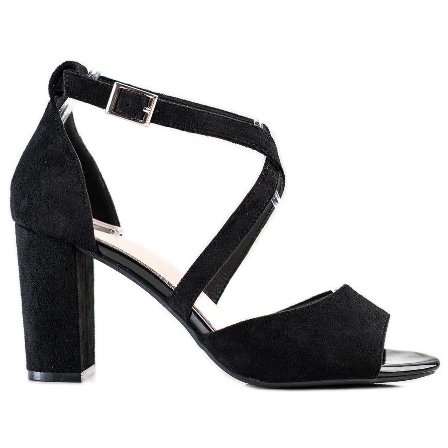 Czółenka zostały wykonane z wysokiej jakości czarnej ekologicznej skóry, co sprawia, że są nie tylko modne, ale i przyjazne dla środowiska. Ich odkryte noski oraz zabudowany zapiętek zapewniają wyjątkowy komfort noszenia, a smukłe przeplecione paski z tworzywa z elegancką srebrną sprzączką dodają całości efektownego charakteru.