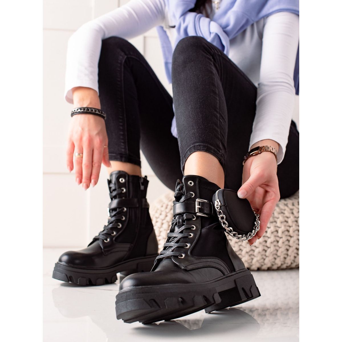 Dużą uwagę zwrócono na praktyczne rozwiązania – zamek oraz sznurowane zapięcie zapewniają łatwe zakładanie i zdejmowanie, a ozdobna sprzączka dodaje charakteru. Podeszwa z bieżnikiem wykonana z tworzywa sztucznego gwarantuje doskonałą przyczepność oraz stabilność na różnych nawierzchniach, a platforma o wysokości 3,5 cm oraz obcas 5 cm pozwala na komfortowe poruszanie się przez cały dzień.