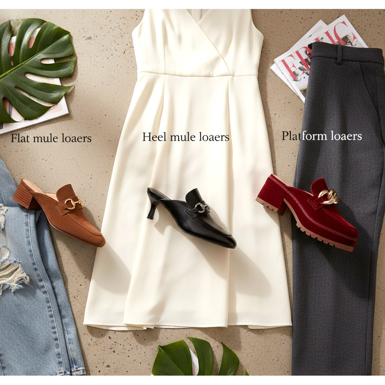 Flat mule loafer — na płaskiej podeszwie lub z drobnym obcasem blokowym. Najpraktyczniejszy wariant, idealny do codziennych stylizacji. Doskonale wygląda w skurzanej wersji w czerni, brązie lub naturalnych barwach, ale równie dobrze sprawdza się w aksamicie lub zamszy na chłodniejsze dni.