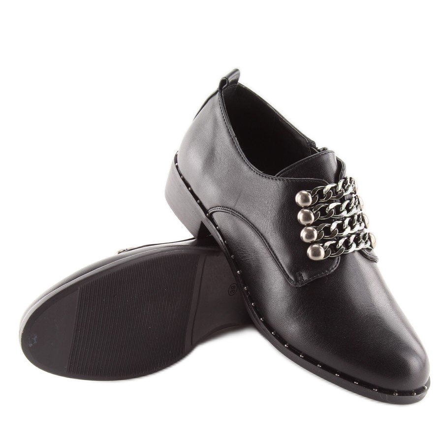 Mokasyny damskie czarne C-7160 Black to doskonały wybór dla kobiet, które pragną połączyć klasykę z modowym akcentem. Te półbuty wyróżniają się eleganckim, ale nietuzinkowym stylem, który przyciąga uwagę. Ozdobne sznurowanie w formie łańcucha dodaje im oryginalności, a lamówka wysadzana drobnymi ćwiekami wprowadza nieco szaleństwa do klasycznego designu.