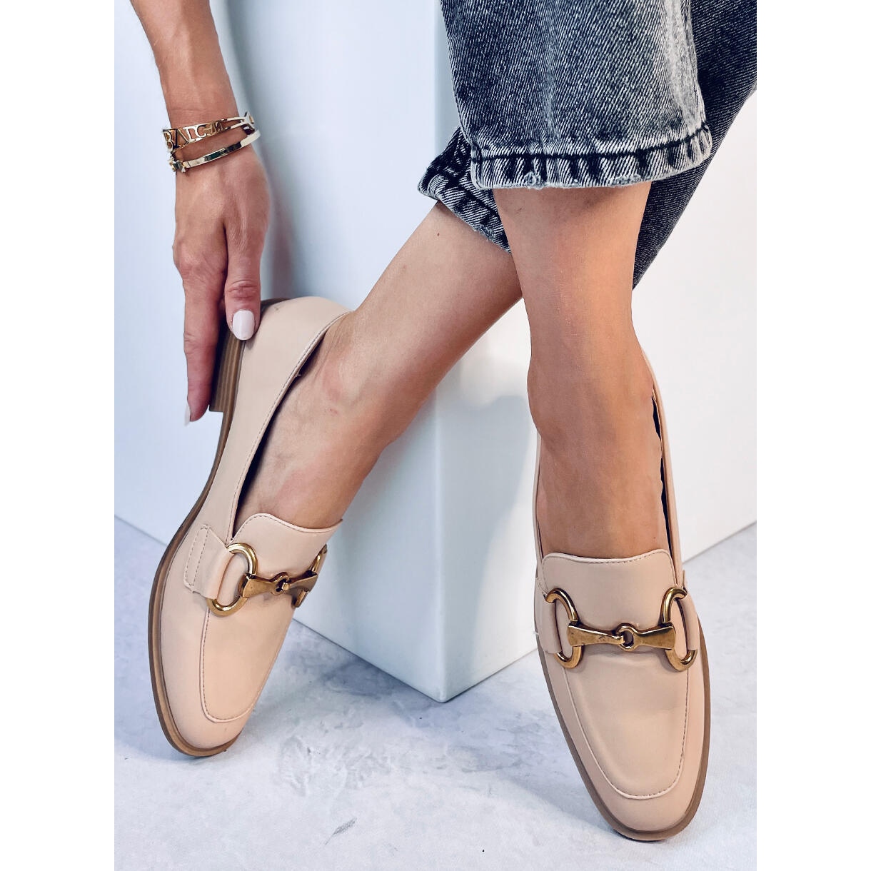 Wykonane z wysokiej jakości skóry ekologicznej, te mokasyny oferują nie tylko styl, ale także komfort użytkowania. Złota ozdoba w postaci łańcucha dodaje im szyku i wyróżnia je na tle innych modeli. Płaski obcas o wysokości 2,5 cm zapewnia wygodę podczas noszenia, a gładki, beżowy kolor świetnie komponuje się z różnorodnymi outfitami.