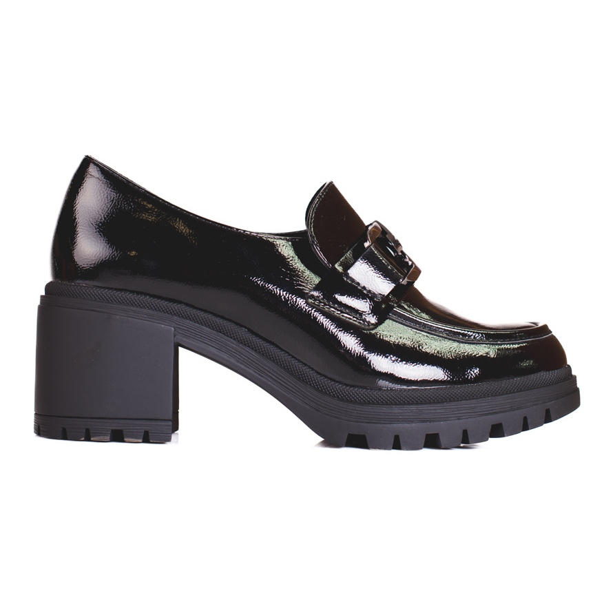 Dzięki obcasowi w kształcie słupka o wysokości 7 cm, mokasyny doskonale podkreślają sylwetkę, a dodatkowa platforma o wysokości 2,5 cm sprawia, że każdy krok jest lekki i pewny. Oryginalna lakierowana skóra ekologiczna, z której wykonano wierzchnią warstwę buta, nadaje im wyjątkowy blask, a naturalna skórzana wkładka zapewnia optymalną wentylację i komfort.