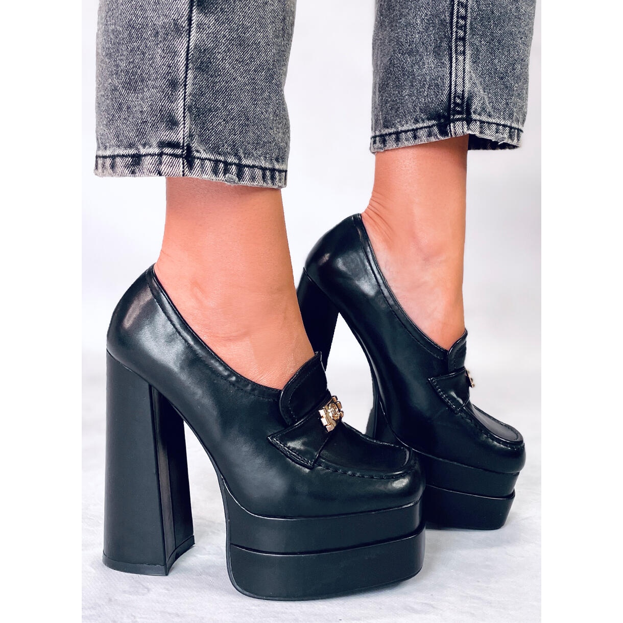 Mokasyny na obcasie Ambra Black — czarne, eleganckie i odważne. Licowe mokasyny damskie na wysokim obcasie (14,5 cm) z 5 cm platformą to propozycja dla kobiet, które chcą dodać sobie wysokości i charakteru, nie rezygnując z wygody. Model w uniwersalnej czerni z kwadratowym noskiem i ozdobnymi cyrkoniami świetnie sprawdzi się zarówno na specjalne okazje, jak i w stylizacjach miejskich.