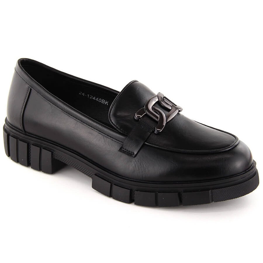 Mokasyny półbuty damskie z łańcuszkiem czarne Potocki 12440 to elegancka propozycja, która z pewnością przypadnie do gustu miłośniczkom stylu casual. Wykonane z wysokiej jakości skóry ekologicznej, gwarantują nie tylko estetyczny wygląd, ale także komfort noszenia. Wyposażone w naturalną skórzaną wkładkę, pozwalają na długotrwałe użytkowanie bez uczucia dyskomfortu.