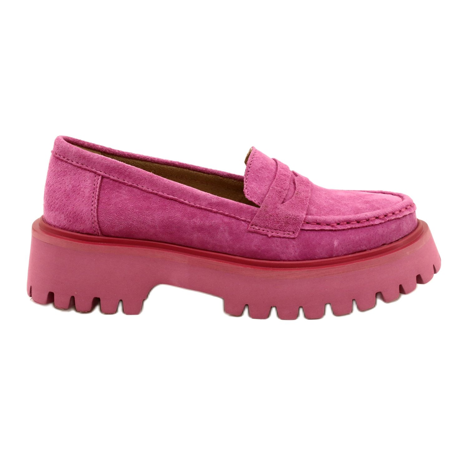 Klasyczne mokasyny w nowoczesnym wydaniu — wykonane z wysokiej jakości zamszowej skóry naturalnej w intensywnym kolorze fuksji. Delikatnie podwyższona podeszwa oraz obcas o wysokości 4,5 cm subtelnie modelują sylwetkę, dodając butom charakteru, a skórzana wkładka zapewnia wygodę noszenia przez cały dzień. Idealne dla kobiet, które szukają elegancji z nutą wyrazistości.