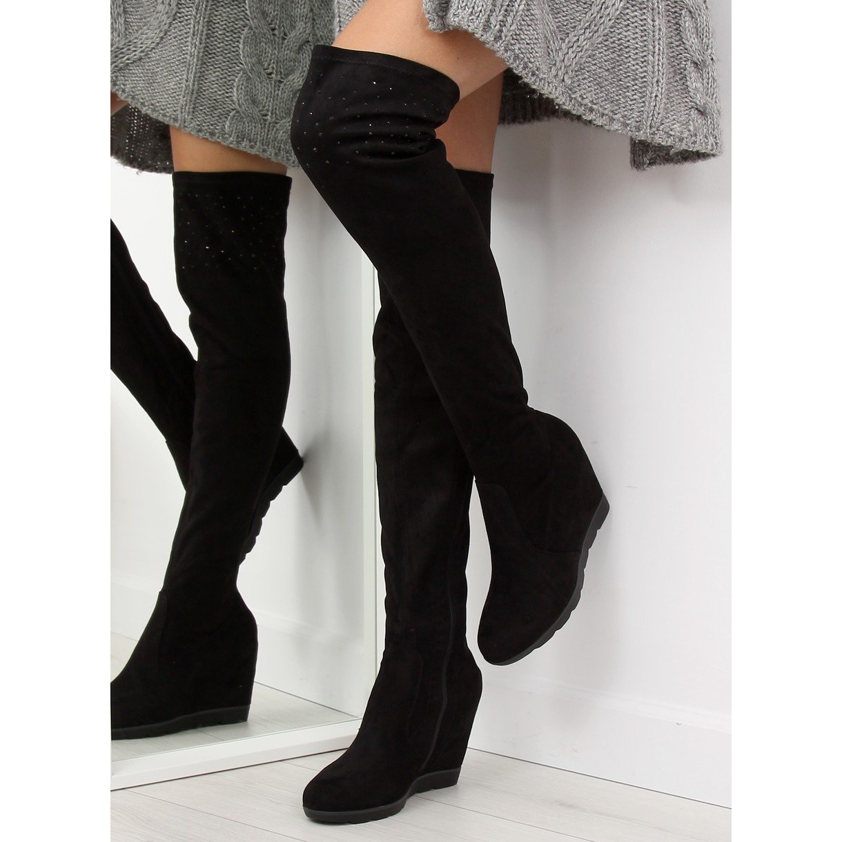 Odkryj wyjątkowy styl i elegancję dzięki muszkieterką na koturnie K-59 w klasycznym czarnym kolorze. Te zachwycające buty damskie, zaprojektowane z myślą o nowoczesnej kobiecie, doskonale łączą modę z wygodą. Wysoka cholewka sięgająca powyżej kolana, ozdobiona subtelnymi kamieniami, nie tylko wysmukla sylwetkę, ale również dodaje szyku każdej stylizacji.
