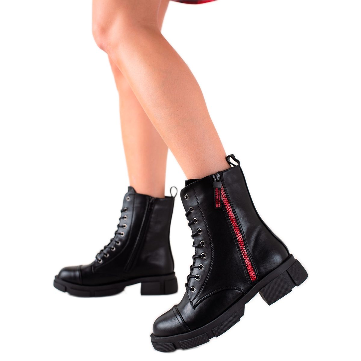 Dzięki płaskiemu obcasowi o wysokości 4 cm i platformie wynoszącej 2 cm, te traperki nie tylko doskonale leżą na stopie, ale także optymalnie podnoszą komfort chodzenia. Okrągły nosek dodaje subtelności, a ozdobny czerwony suwak przyciąga wzrok, czyniąc ten model wyjątkowym dodatkiem do każdej codziennej stylizacji.