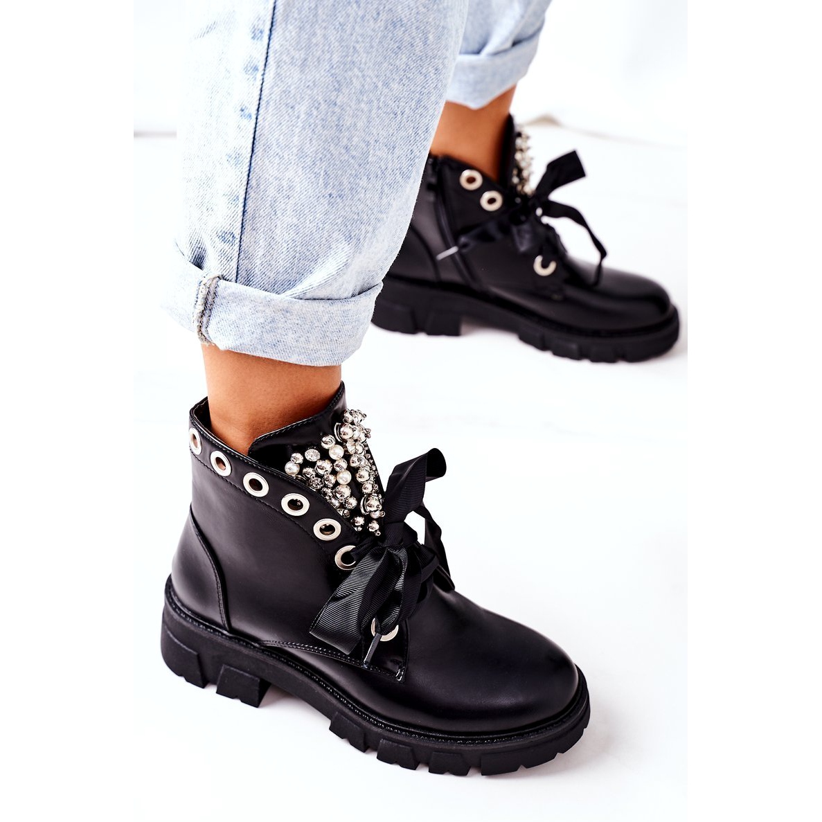 Szczegóły: PS1 Ocieplane Workery Z Metalowymi Perełkami Czarne Perla