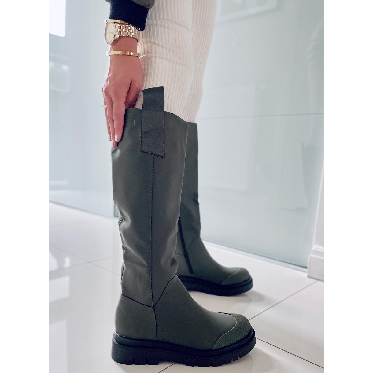 Dzięki płaskiemu obcasowi oraz podwyższeniu w postaci platformy, modele te są nie tylko wygodne, ale również dodają lekkości każdemu krokowi. Wysokość kozaka sięgająca do kolana optycznie wydłuża nogi i doskonale komponuje się z różnorodnymi stylizacjami, od casualowych po bardziej eleganckie.