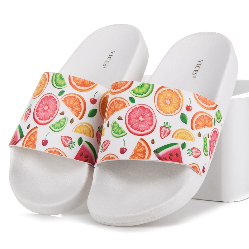 Odkryj orzeźwiający styl dzięki klapkom Vices z owocowym wzorem w kolorze białym! Jeżeli chcesz dodać swojemu letniemu lookowi nieco świeżości i energii, te klapki są idealnym rozwiązaniem. Wykonane z ekologicznej skóry, charakteryzują się wysoką jakością i wygodą noszenia, co czyni je doskonałym wyborem na co dzień.