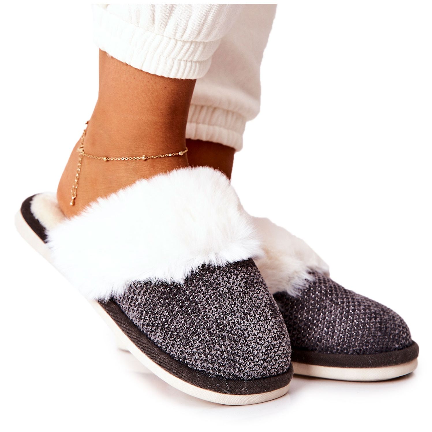 Środek papci wypełniony jest miękkim futerkiem, które dodatkowo ociepla, sprawiając, że każdego dnia poczujesz się jak w chmurach. Okrągły nosek oraz brak obcasa to gwarancja wygody noszenia, a niska wysokość oraz syntetyczna podeszwa zapewniają stabilność na każdym kroku.