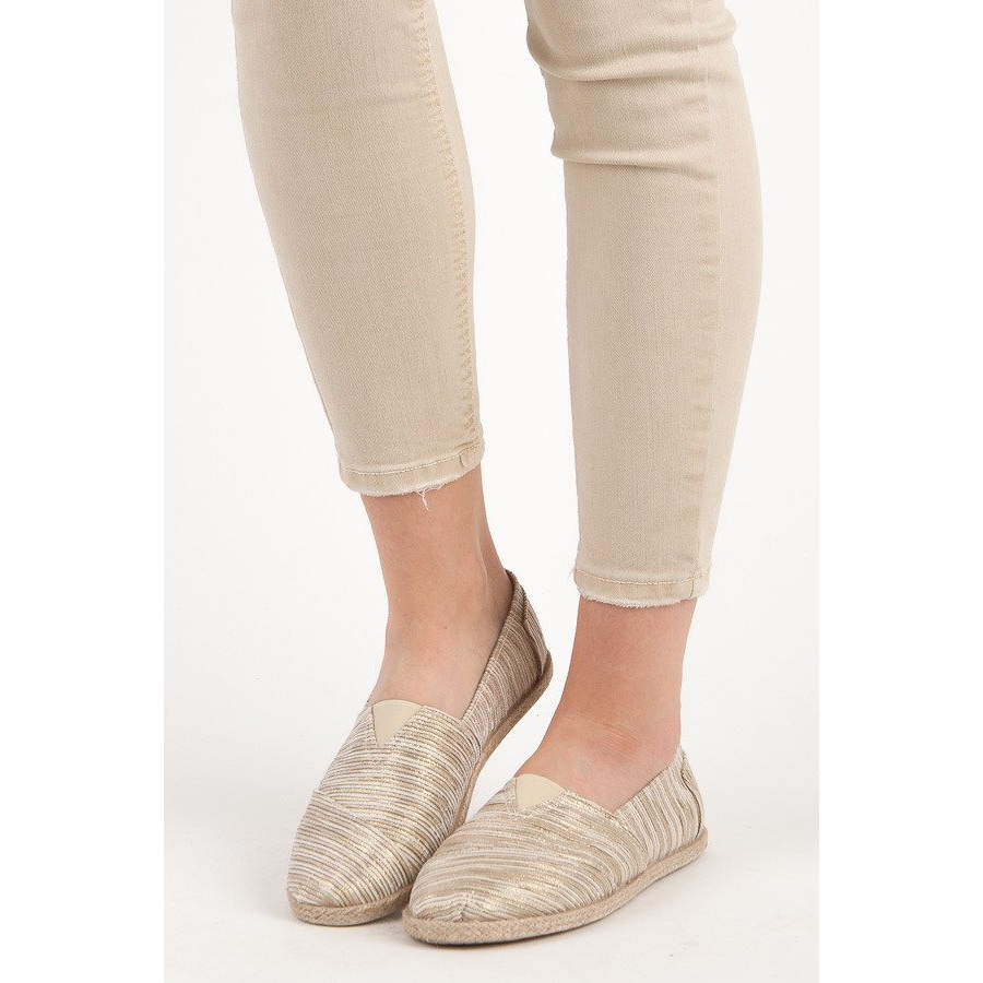 Wierzch espadryli powstał z tkaniny o atrakcyjnym wzorze w paski, który nadaje im lekkości i świeżości. Okrągły nosek zapewnia wygodę podczas noszenia, a wsuwane zapięcie sprawia, że zakładanie i zdejmowanie butów jest niezwykle proste.
