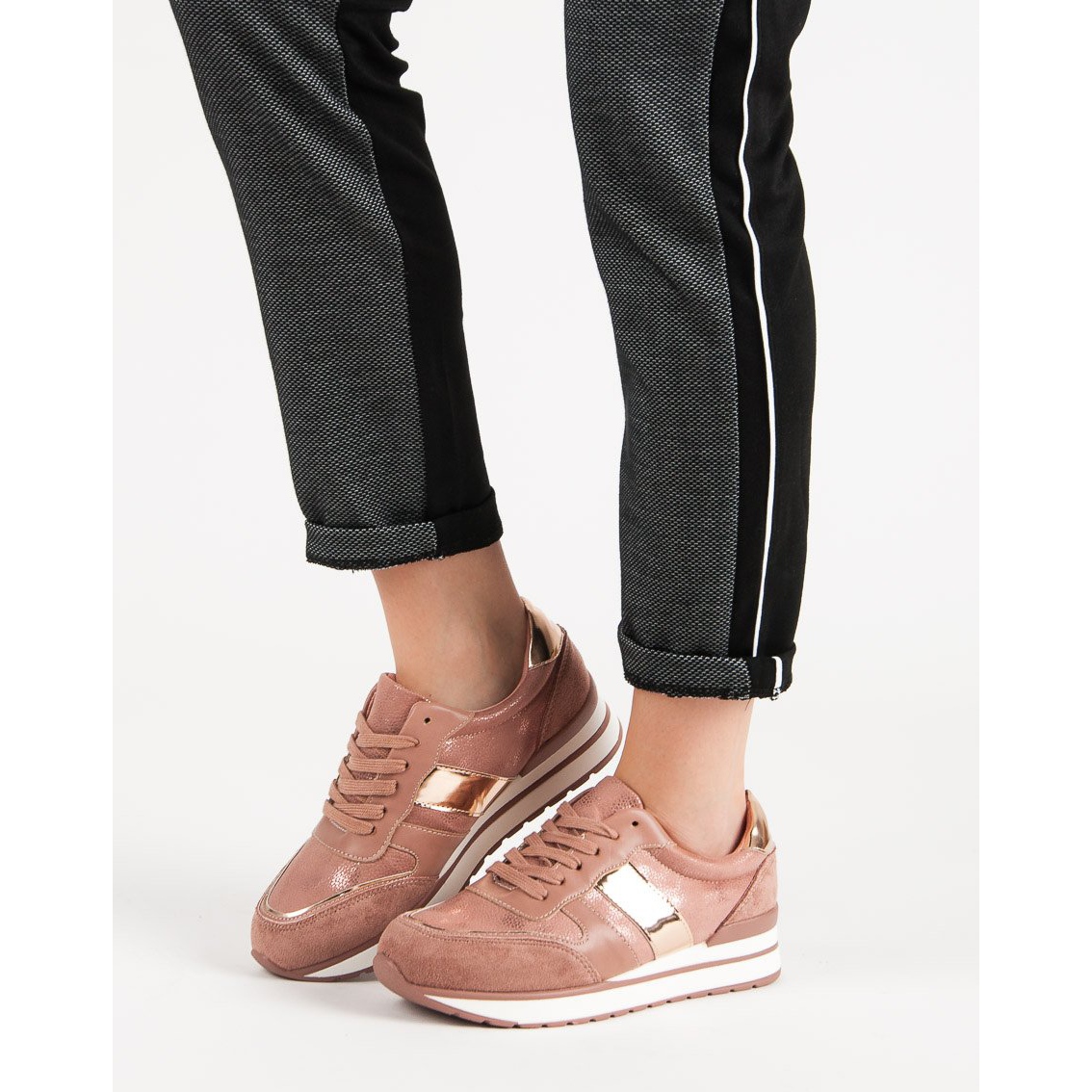 Wykonane z wysokiej jakości materiałów, w tym ekoskóry oraz syntetycznej podeszwy, zapewniają komfort noszenia, while providing excellent grip thanks to the specially designed tread pattern. Złote akcenty dodają im elegancji, a pudrowy róż nadaje lekkości i świeżości każdej stylizacji.