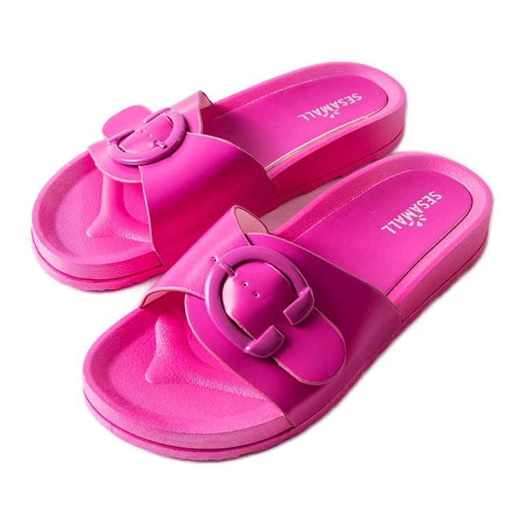 Dzięki klasycznemu zapięciu wsuwanemu, te klapki są niezwykle praktyczne i łatwe w zakładaniu. Brak noska sprawia, że są one przewiewne, co dodatkowo podnosi komfort ich noszenia. Te różowe klapki doskonale będą wyglądać w połączeniu z letnimi sukienkami, szortami czy casualowymi stylizacjami.