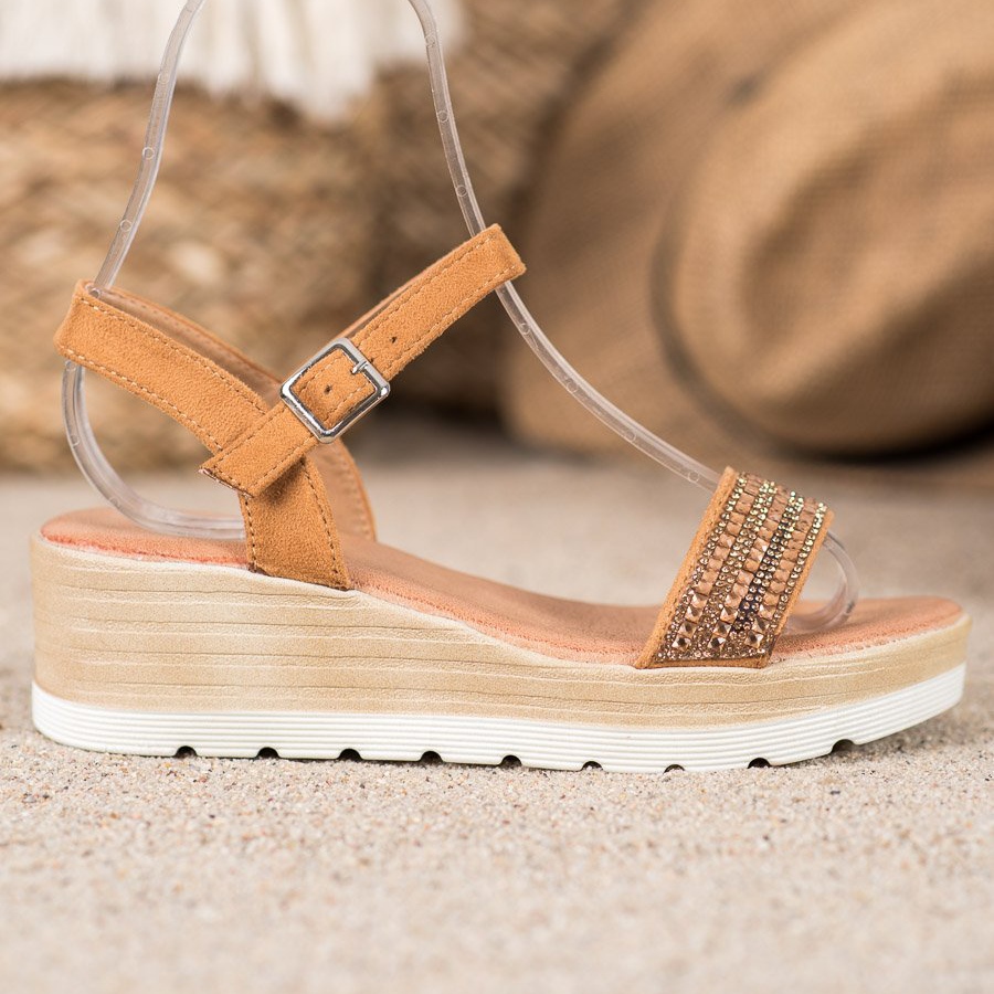 Szczegóły: Renda Sandałki Na Koturnie Z Kryształkami brązowe