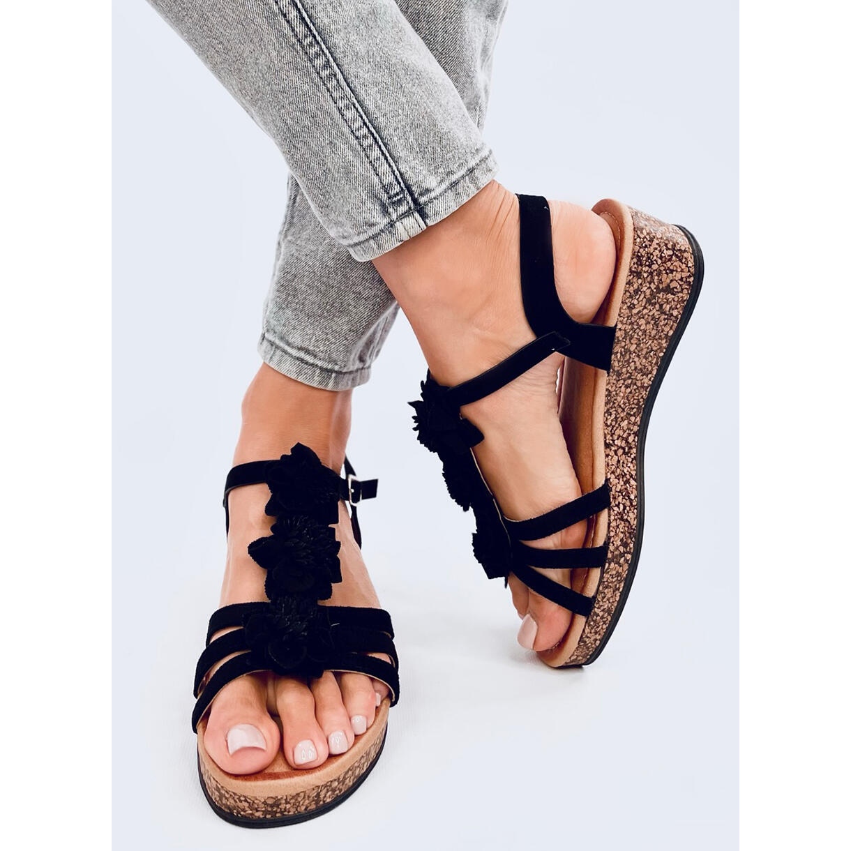 Szczegóły: Sandałki na koturnie z kwiatami Fisken Black czarne
