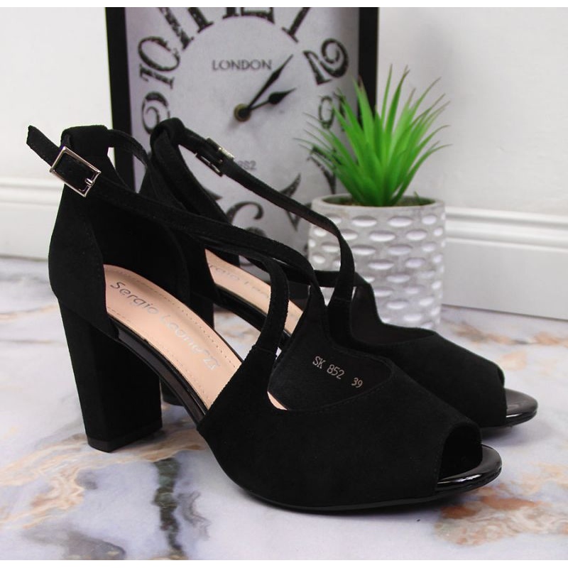 Sandały na słupku Sergio Leone W SK210C — klasyka w czerni, która sprawdzi się w letnich stylizacjach. Elegancki fason z otwartym noskiem i stabilnym obcasem typu słupek (8,5 cm) łączy kobiecy wygląd z wygodą noszenia. Idealne na co dzień i na wieczorne wyjścia.