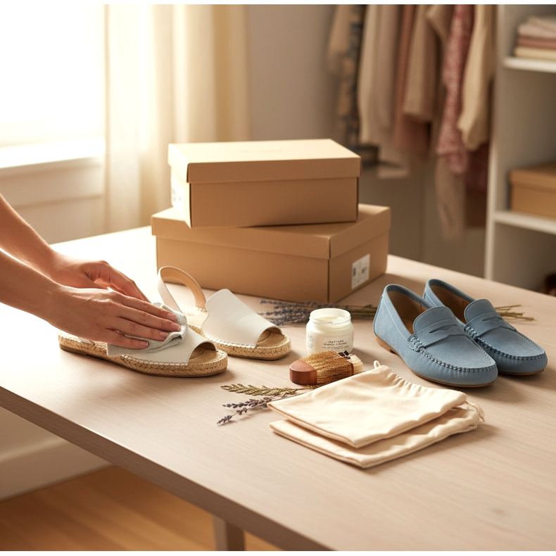 Przed schowaniem butów letnich na sezon, upewnij się, że są czyste i suche. Każdy ślad brudu lub potu może prowadzić do trwałych plam lub zapachu. Wytrzyj je czystą szmatką i pozwól im całkowicie wyschnąć. Jeśli buty są zamszowe lub skórzane, nałóż ochronny balsam. Pamiętaj, aby przechowywać je w chłodnym, suchym miejscu – nigdy nie w jasnym słońcu, które może odbarwić obuwie. Jeśli możesz, schowaj je w pudełkach lub materialowych workach, aby chronić je przed kurzem.