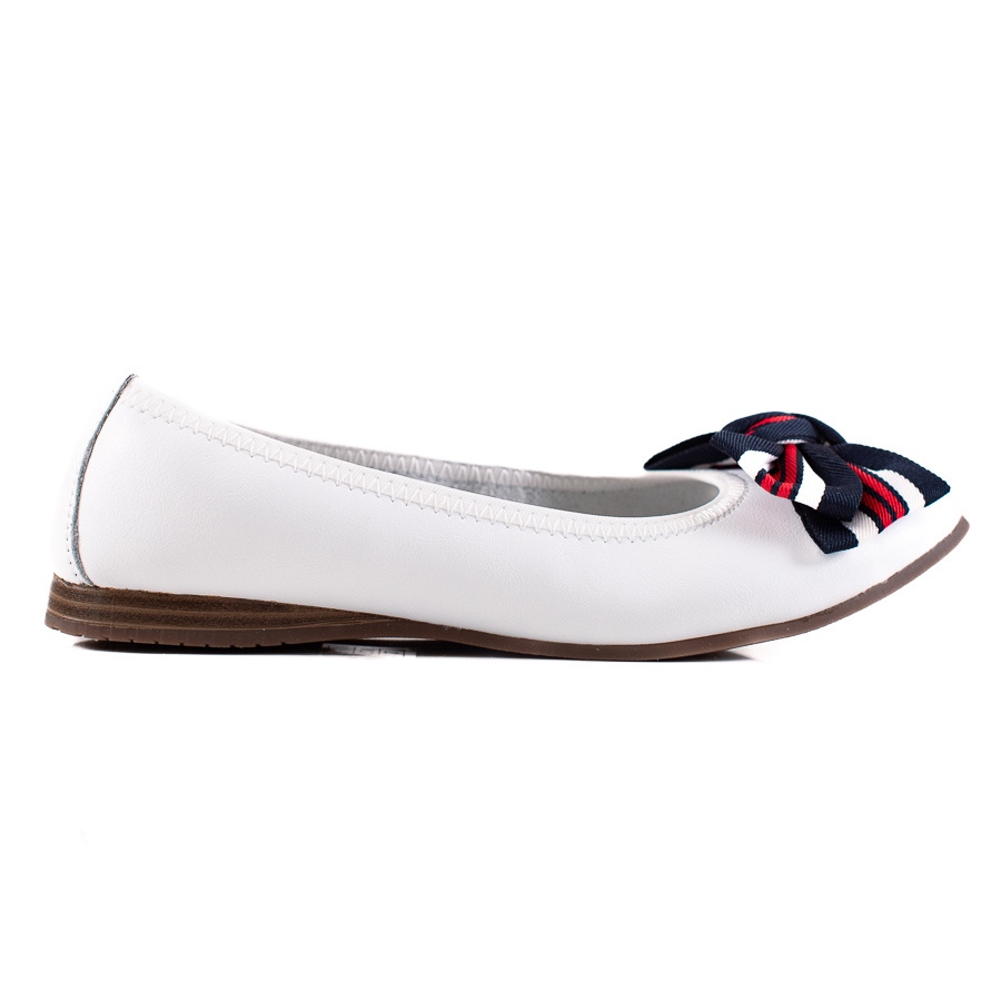 Model wyróżnia się okrągłym noskiem, co dodaje mu subtelności, a delikatna kokardka z przodu wprowadza nutę kobiecego wdzięku. Gładka podeszwa z tworzywa sztucznego w beżowym kolorze idealnie komponuje się z białą cholewką, tworząc harmonijną całość. Wysokość podeszwy wynosi zaledwie 1.3 cm, co sprawia, że baleriny są niezwykle wygodne, doskonałe na wiosnę i lato.