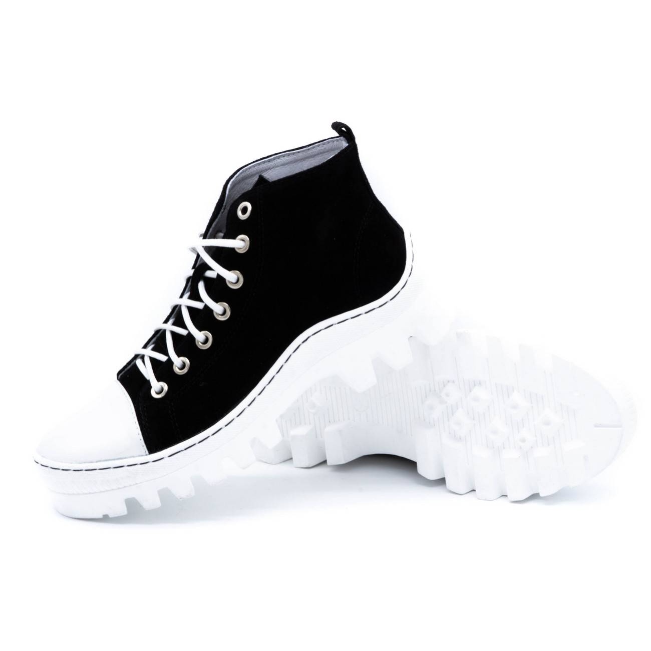 Wykonane z wysokiej jakości naturalnej skóry zamszowej w odcieniu czarnego „black (czarna perła)”, z kontrastową białą podeszwą. Wnętrze i wkładka także z naturalnej skóry, co zapewnia komfort i dobrą oddychalność stopy. Stabilna platforma o wysokości 4 cm oraz wysoka cholewka sięgająca przed kostkę (9 cm) gwarantują wygodę podczas dłuższych spacerów i dodają subtelnej wysokości. Botki mają okrągły nosek i klasyczne sznurowanie, dzięki któremu łatwo dopasujesz je do stopy. Brak ocieplenia – idealne na przejściowe i chłodniejsze dni bez mrozu.
