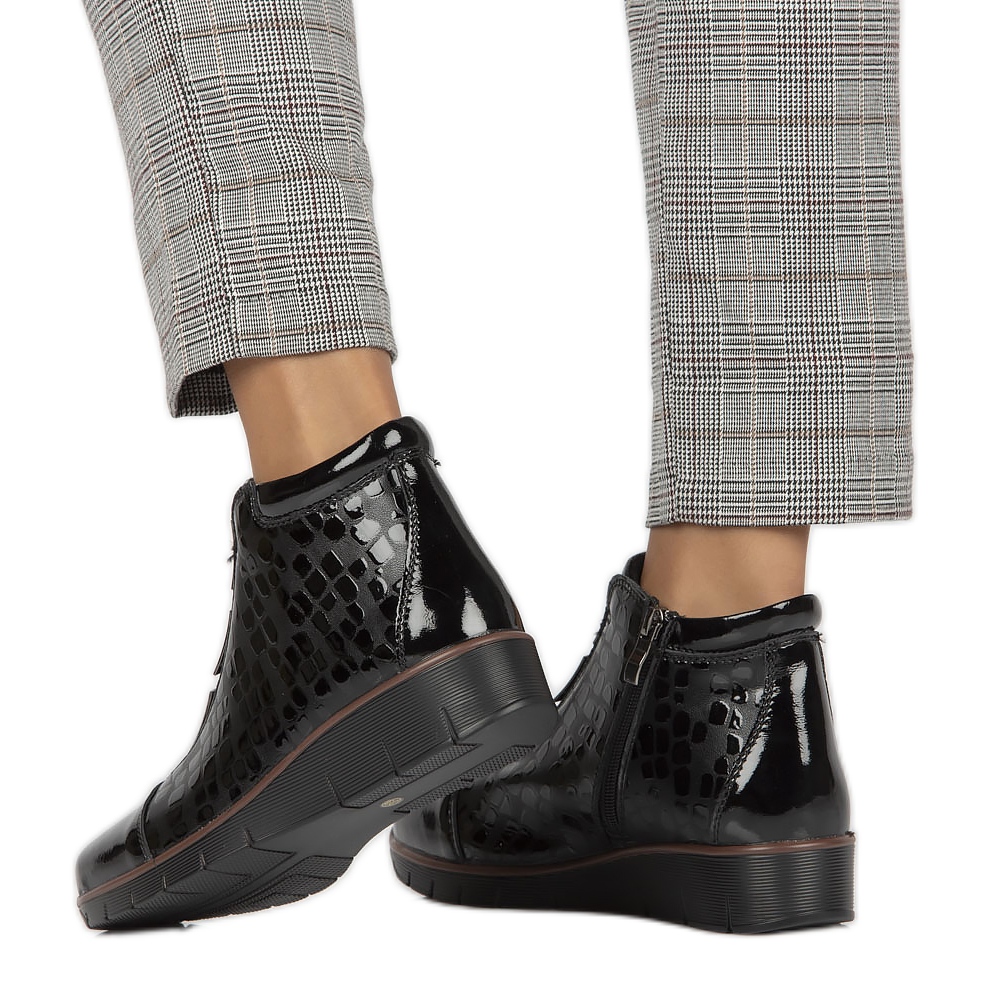 Botki Filippo PAW277A wyróżniają się również atrakcyjnym koturnem o wysokości 3.5 cm, który dodaje lekkości i optycznie wydłuża nogi. Okrągły nosek oraz lakierowane wykończenie nadają im oryginalnego charakteru, a zwierzęcy wzór podkreśla nowoczesny design.