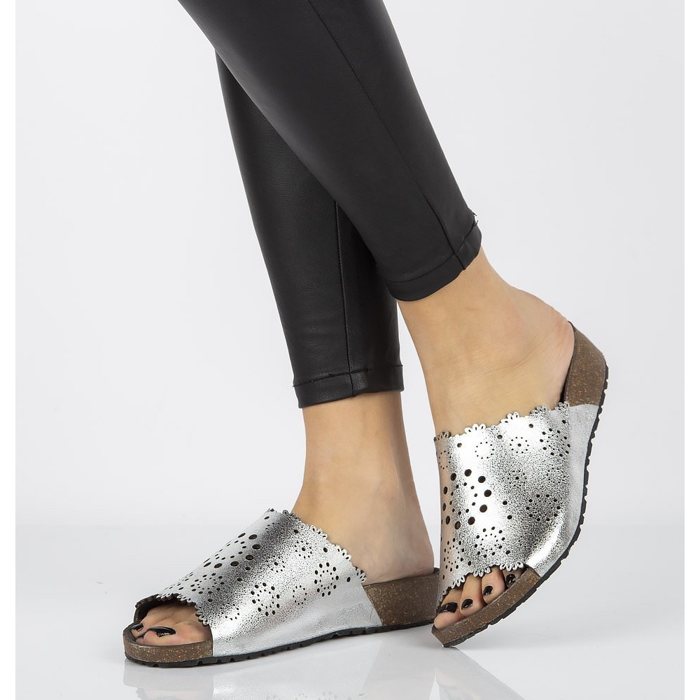 Skórzane klapki Filippo DK1270/20 Si w eleganckim srebrnym kolorze to idealna propozycja dla kobiet, które cenią sobie modę i wygodę na co dzień. Wykonane z wysokiej jakości materiałów, zapewniają wygodę użytkowania, dzięki naturalnej skórzanej podszewce oraz wkładce, która dopasowuje się do kształtu stopy.