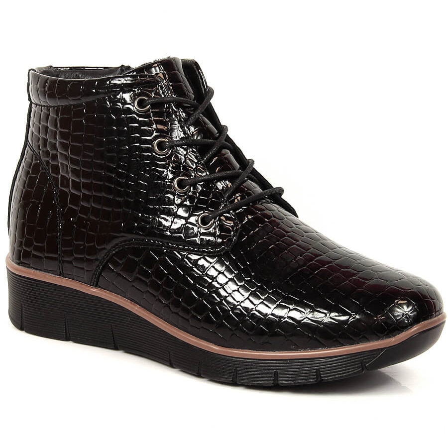 Szczegóły: Skórzane lakierowane botki na koturnie ocieplane czarne Filippo