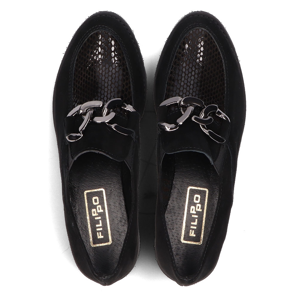 Oto eleganckie i wygodne skórzane mokasyny Filippo 124 w kolorze czarnym, które są idealnym wyborem dla kobiet ceniących sobie komfort i styl. Te modowe buty doda każdej stylizacji odrobinę luksusu dzięki zdobieniu w postaci łańcucha, które przyciąga wzrok i nadaje im niepowtarzalnego charakteru.