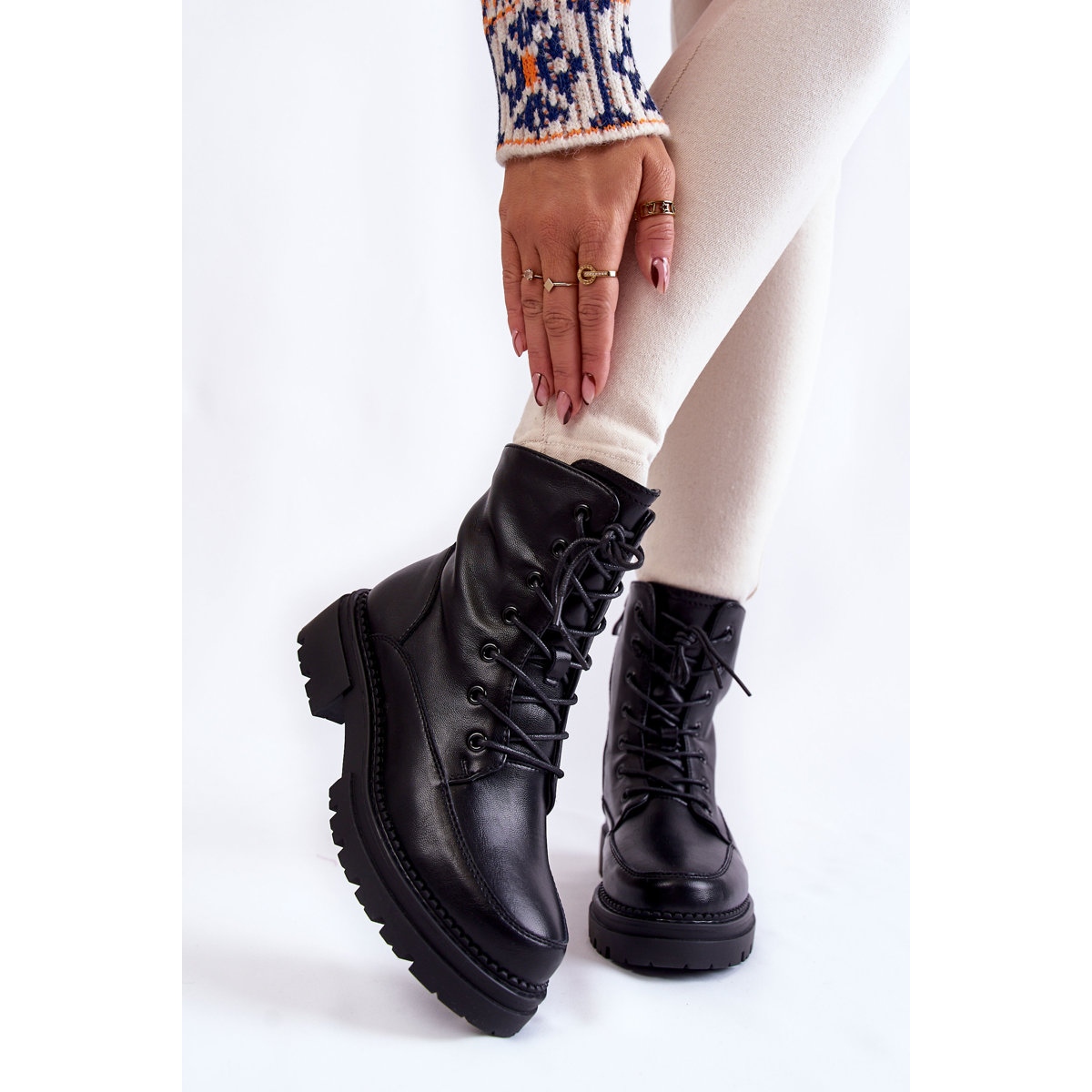 Botki są ocieplane miękkim kocem obuwniczym, co sprawia, że są doskonałym wyborem na chłodniejsze dni. Dzięki zapięciu na suwak oraz sznurowanej cholewce, można je łatwo zakładać i doskonale dopasować do stopy. Płaski obcas o wysokości 4,5 cm oraz platforma z żłobieniami zapewniają wygodę podczas noszenia, a usztywniany zapiętek podkreśla stabilność.