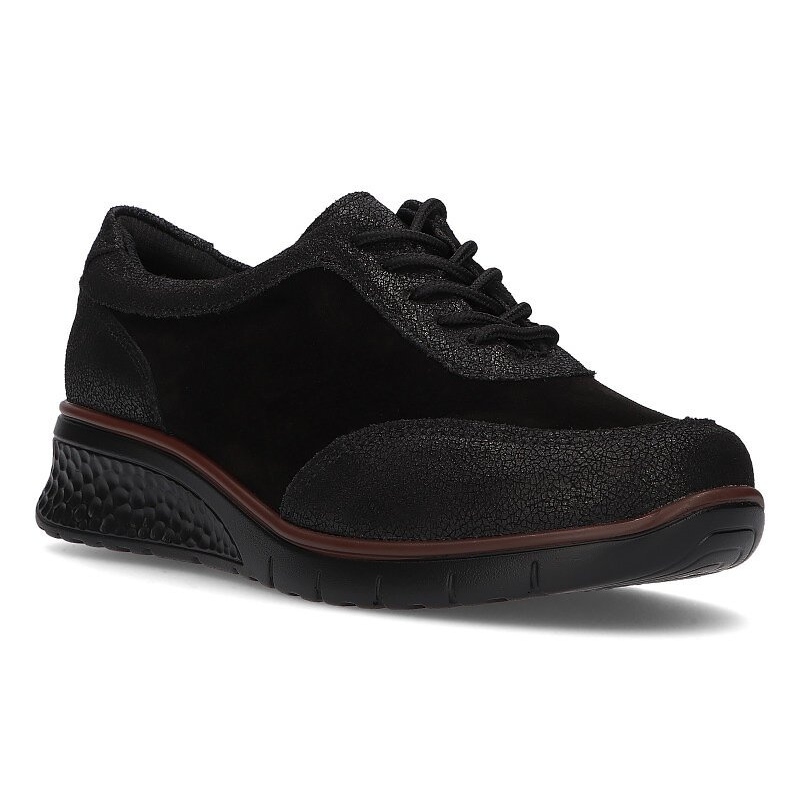 Model DP1509/20 BK charakteryzuje się okrągłym noskiem oraz sznurowanym zapięciem, co ułatwia dopasowanie do stopy. Wnętrze buta wyłożone jest materiałem, a wkładka z ekologicznej skóry zapewnia odpowiednią wentylację, co jest istotne podczas dłuższego noszenia.