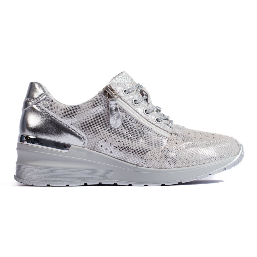 Te srebrne sneakersy na koturnie to idealna propozycja dla kobiet ceniących sobie połączenie sportowego stylu z elegancją. Doskonałe do codziennych stylizacji, świetnie sprawdzą się zarówno w mieście, jak i podczas spacerów. Wybierz wygodę i styl z tym wyjątkowym modelem, który z pewnością stanie się ulubioną parą w Twojej kolekcji!