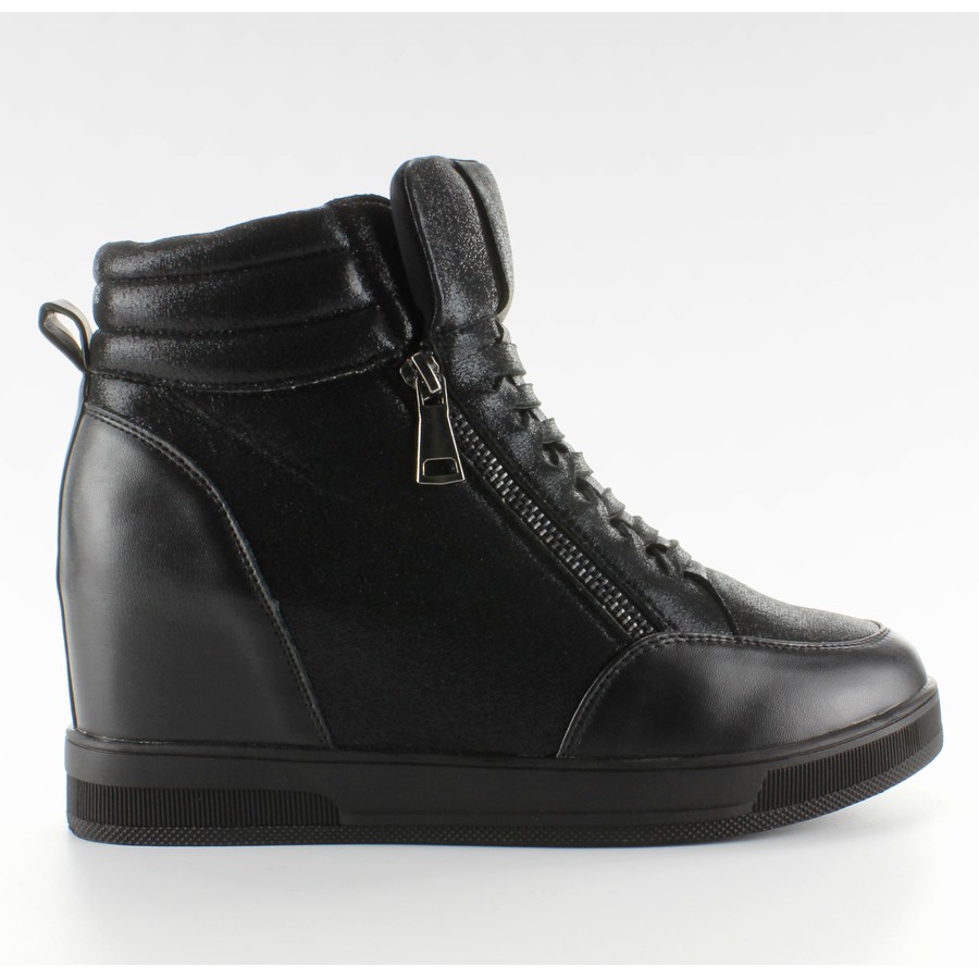 Sneakersy R13 — czarne, na ukrytym koturnie (6,5 cm), łączą sportowy charakter z kobiecą sylwetką. Wysoka cholewka za kostkę podkreśla nogę, a ukryty koturn dyskretnie wysmukla i dodaje kilka centymetrów bez rezygnacji z wygody. Z przodu ozdobne sznurowanie nadaje stylu, a praktyczne suwaki po bokach ułatwiają szybkie zakładanie i zdejmowanie.