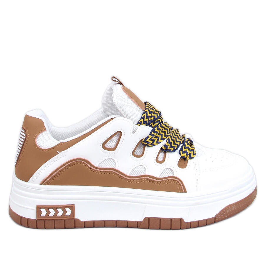Te buty sportowe na platformie wyróżniają się atrakcyjną kolorystyką - klasyczna biel w połączeniu z brązowymi akcentami sprawia, że są niezwykle wszechstronne i łatwo je dopasować do różnych stylizacji. Szerokie, wzorzyste sznurówki przyciągają wzrok i dodają całości oryginalnego charakteru.
