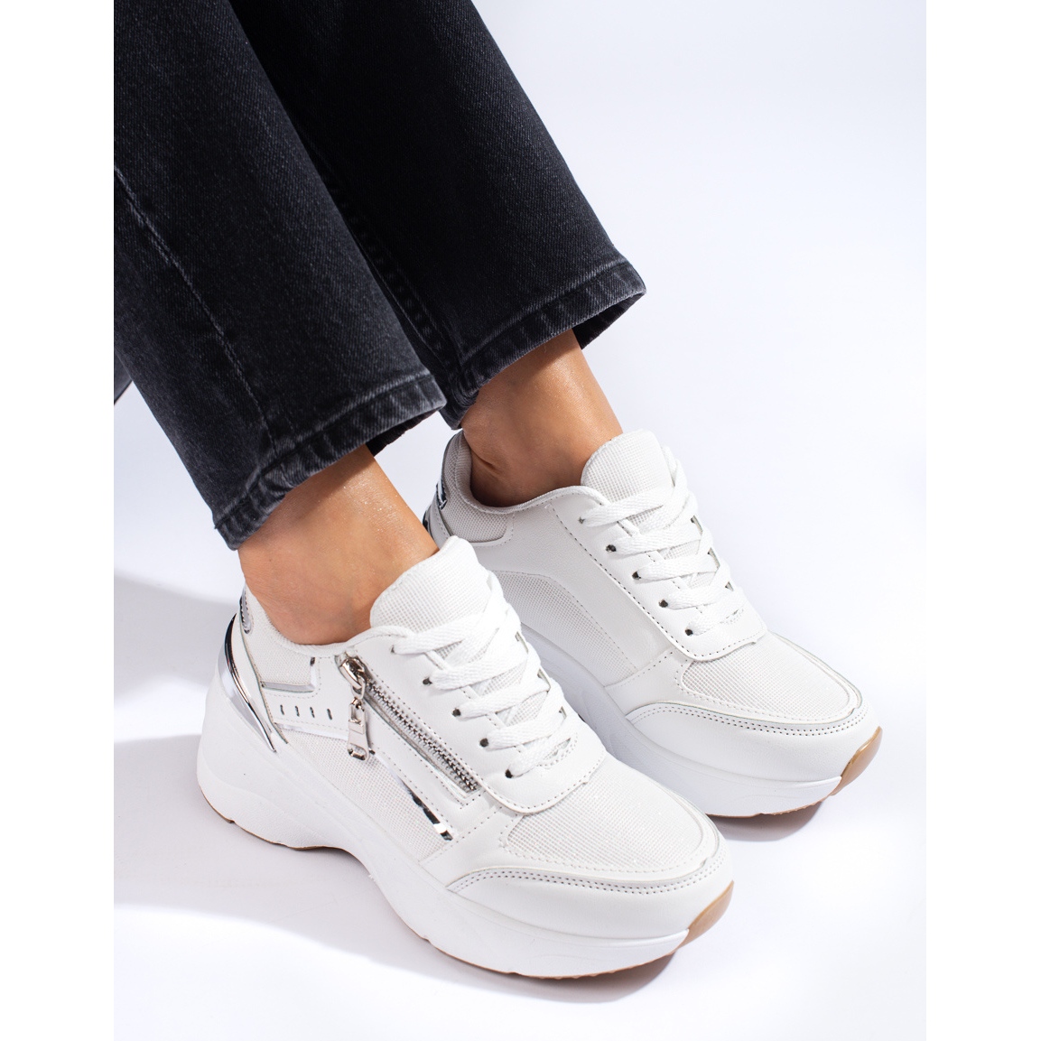 Jak przystało na sneakersy, buty te nie posiadają obcasa, a okrągły nosek i zabudowany, miękki zapiętek zapewniają maksymalne poczucie wygody. Ozdobione dodatkowym srebrnym kolorem nadają butom nieco charakteru, jednocześnie zachowując uniwersalność białego koloru. Wyrób sygnowany nazwą koloru producenta "White" doskonale wpisuje się w trend minimalistycznych, ale efektownych dodatków.