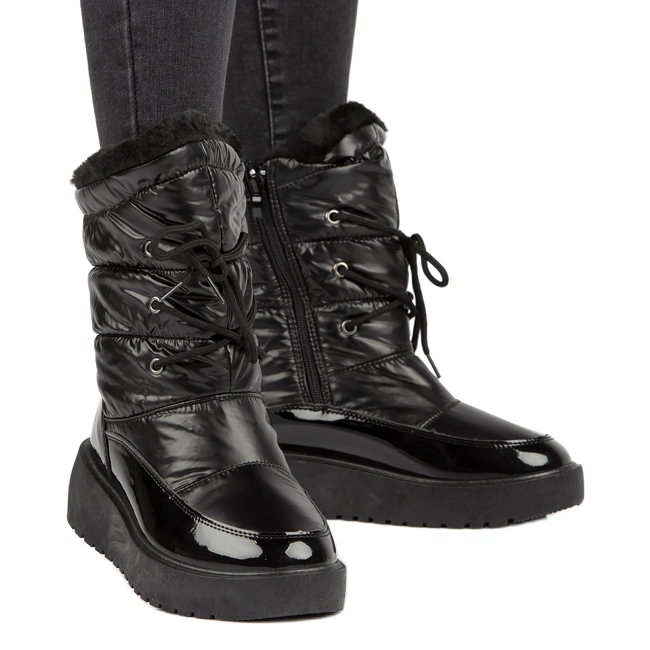 Ich płaski obcas o wysokości 4,5 cm oraz sportowa cholewka gwarantują wygodę i stabilność podczas noszenia. Zapinane na suwak oraz sznurowane, te śniegowce przyciągają wzrok swoim nowoczesnym stylem, a ich uniwersalna czarna kolorystyka sprawia, że pasują do każdej zimowej stylizacji.