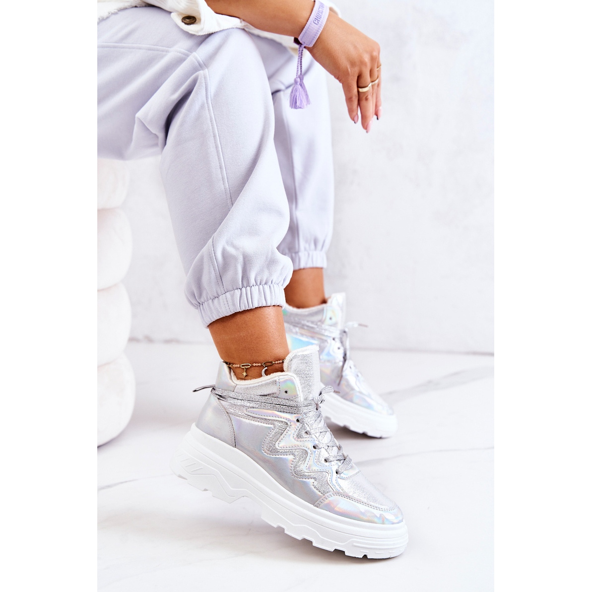 Nowoczesne, wysokie buty sportowe Joenne łączą modny, metaliczny połysk z praktycznymi właściwościami ocieplenia. Gruba, masywna podeszwa i miękkie futerko wewnątrz zapewniają ciepło i wygodę podczas chłodniejszych dni, a uniwersalny srebrny kolor doda charakteru wielu stylizacjom.