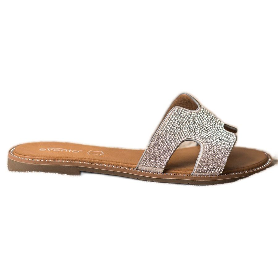 Srebrne klapki z kryształkami marki Evento to doskonały wybór dla kobiet, które pragną połączyć casualowy styl z elegancją. Te modne klapki, idealne na wiosnę i lato, wyróżniają się wsuwanym zapięciem oraz otwartym zapiętkiem, co zapewnia wygodę podczas noszenia.