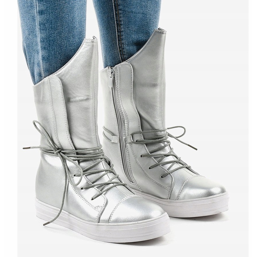 Srebrne sneakersy ocieplane botki HX5187-5 w kolorze szarym to doskonała propozycja dla kobiet, które pragną wyróżnić się w tłumie. Ich futurystyczny wygląd i oryginalne detale sprawiają, że są idealnym uzupełnieniem modnych stylizacji. Wysoka cholewka oraz okrągły nosek zapewniają komfort noszenia i doskonałą stabilność.