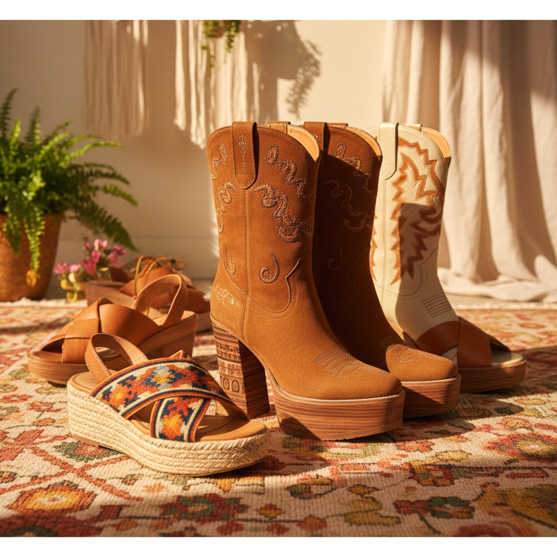 Kowbojki, czyli botki inspirowane obuwiem kowbojów z Dzikiego Zachodu, również mają korzenie w modzie lat 70. Charakteryzują się szpiczastym noskiem, skośnym obcasem i ozdobnymi przeszyciami. Noś je do jeansów typu bootcut lub z długimi, zwiewanymi sukienkami w stylu boho, by stworzyć autentyczny look tej epoki.