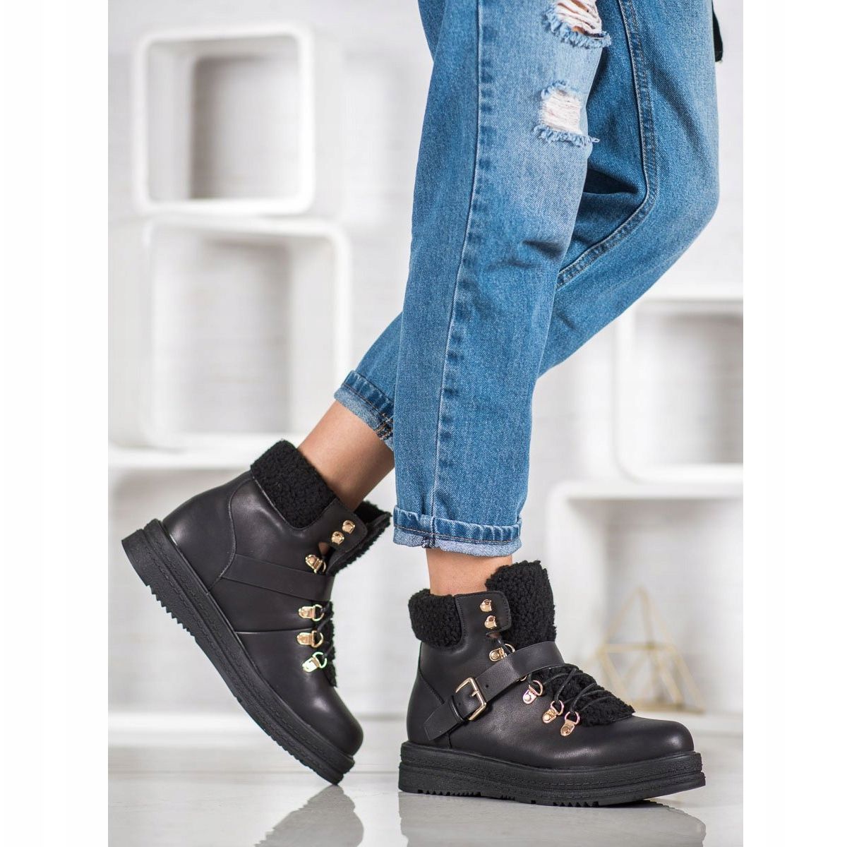 Botki posiadają sznurowanie, dzięki któremu można je idealnie dopasować do kształtu stopy, co zapewnia komfort noszenia. Zabezpieczone kożuszkiem na cholewce i ozdobną sprzączką, przyciągają wzrok i dodają charakteru każdej stylizacji. Podeszwa z bieżnikiem zapewnia stabilność i wygodę w czasie chodzenia, a wysokość obcasa wynosząca 3-5 cm sprzyja długotrwałemu użytkowaniu bez uczucia zmęczenia.