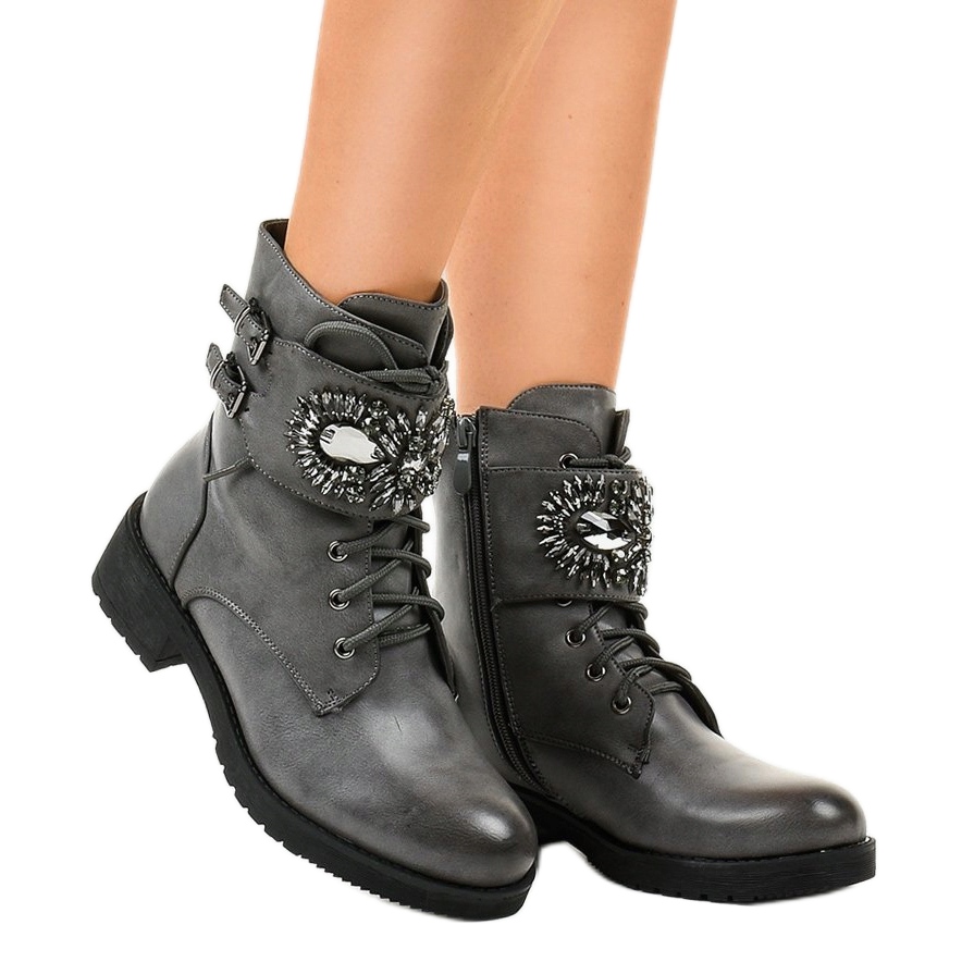 Szczegóły: Szare botki damskie z klamrą i diamentami 0-251