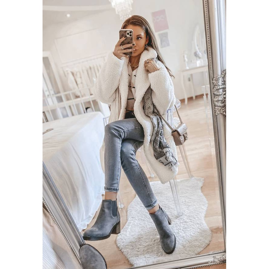 Hanah — szare botki na słupku, które dopełnią każdą codzienną stylizację. Klasyczny, migdałowy nosek i stabilny obcas typu słupek (klocek) o wysokości 6 cm zapewniają elegancki wygląd i wygodę noszenia. Wykonane ze skóry ekologicznej o zamszowym wykończeniu, z praktycznym zamkiem po boku — łatwe do zakładania i zdejmowania. Miękkie ocieplenie wewnątrz gwarantuje komfort w chłodniejsze dni, dlatego sprawdzą się idealnie na wiosnę i jesień.