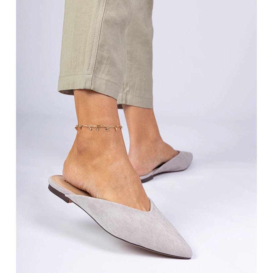 Ich płaski obcas o wysokości 1 cm gwarantuje wygodę noszenia przez cały dzień, a elegancki fason z noskiem w szpic nadaje całości szlachetności oraz wyjątkowego charakteru. Odcień szarości harmonijnie współgra z beżową podeszwą z tworzywa sztucznego, co sprawia, że klapki te bez trudu można zestawiać zarówno z casualowymi, jak i bardziej eleganckimi strojami.