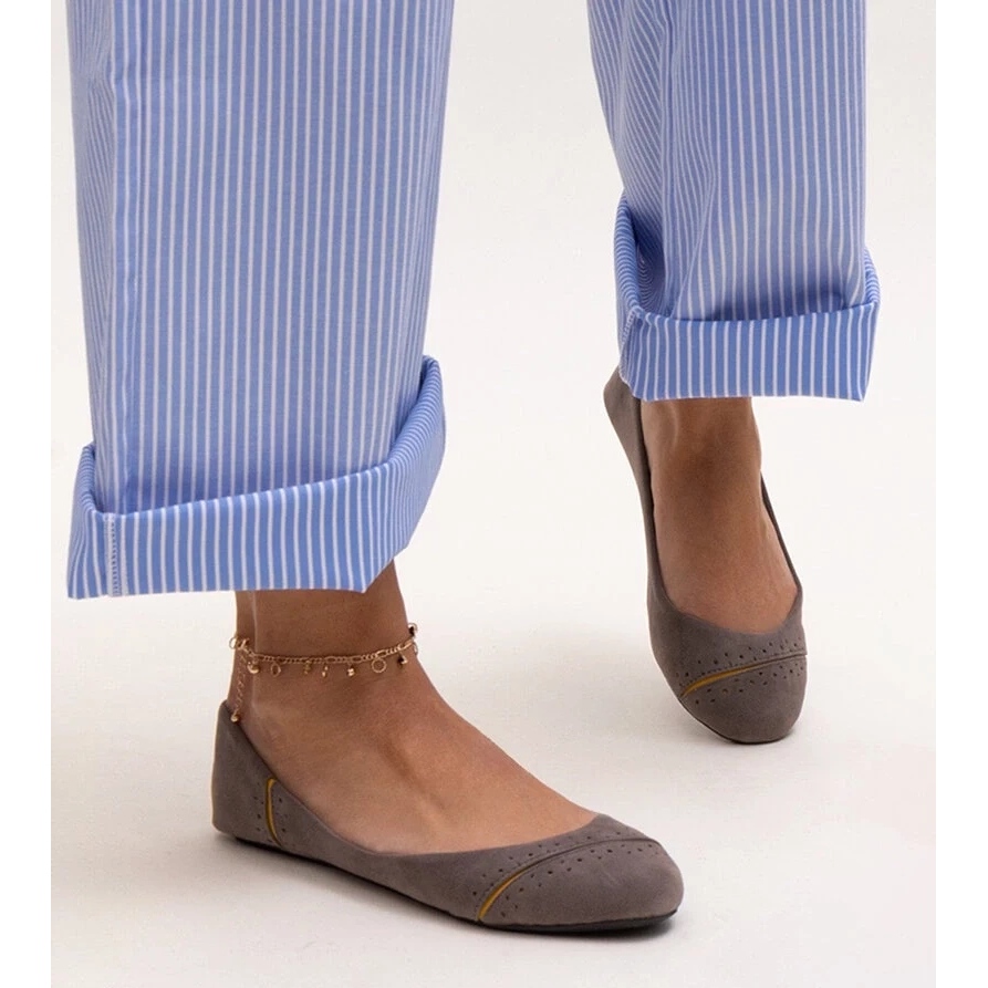 Przedstawiamy szare klasyczne baleriny Dorris – idealny wybór na letnie dni, które łączą w sobie elegancję oraz wygodę. Te baletki wyróżniają się migdałowym noskiem, co nadaje im subtelnego, ale zarazem modnego charakteru. Dzięki niskiej, płaskiej podeszwie wykonanej z gumy, możesz cieszyć się komfortem przez cały dzień, nie rezygnując przy tym z wyjątkowego stylu.