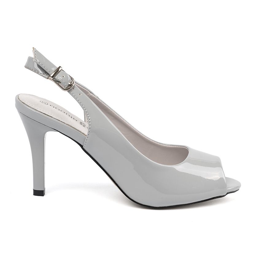 Sandały Goodin w eleganckim szarym kolorze to idealny wybór na wiosenne i letnie wieczorne wyjścia oraz uroczystości. Wykonane z ekologicznej skóry, zachwycają zarówno swoim wyglądem, jak i komfortem noszenia. Model ten charakteryzuje się otwartym zapiętkiem oraz nogą w formie pięknej szpilki o wysokości 9 cm, co sprawia, że optycznie wydłuża i wysmukla sylwetkę.