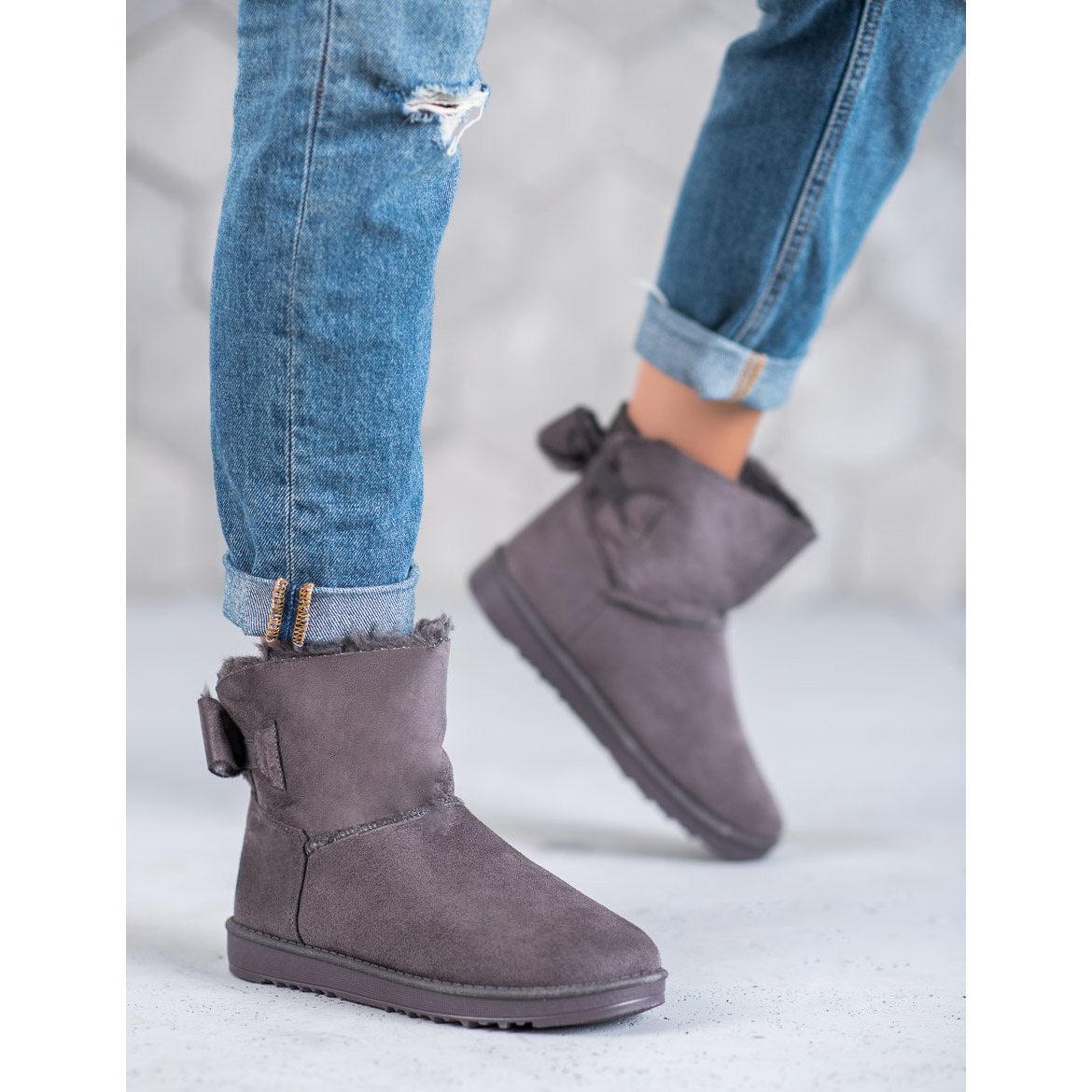 Szare mukluki z kokardką to idealny wybór na nadchodzący sezon jesienno-zimowy dla każdej kobiety, która ceni sobie połączenie komfortu i stylu. Wykonane z ekologicznego zamszu, te buty nie tylko prezentują się niezwykle elegancko, ale także przyjemnie otulają stopy, zapewniając im ciepło dzięki futerkowemu ociepleniu wewnątrz.