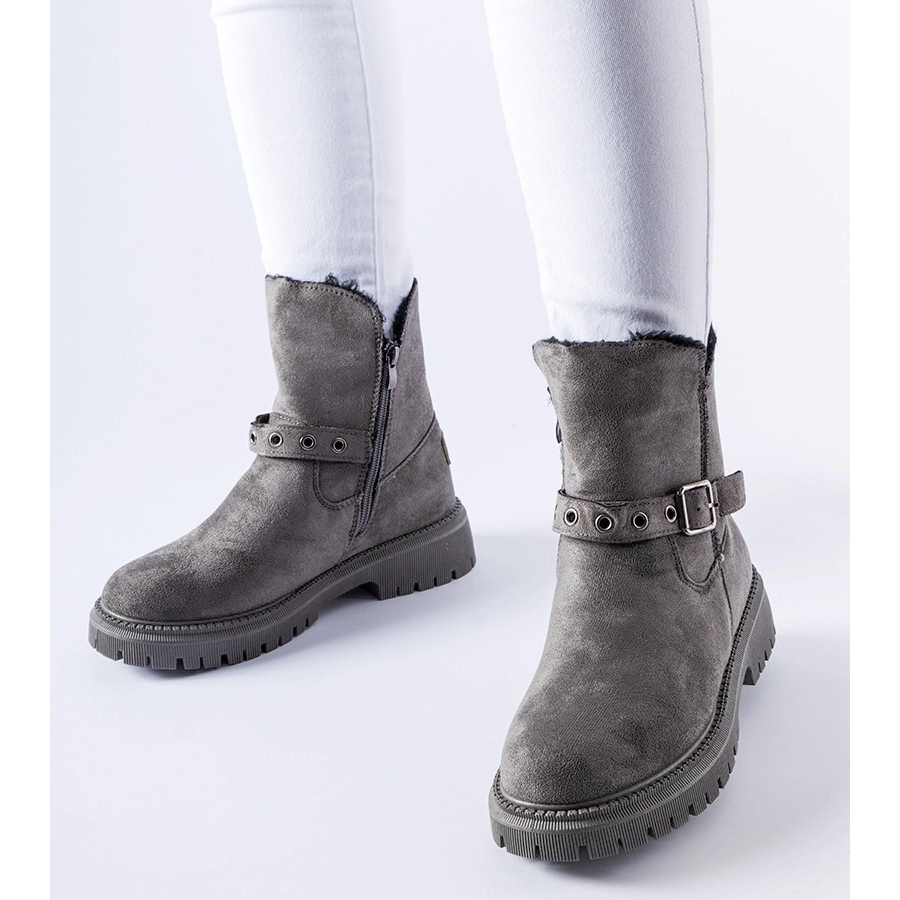 Szare ocieplane botki Gibsonia (model E8218-5) — stylowe, wygodne i gotowe na chłodniejsze dni. Klasyczna szarość w zamszowym wykończeniu świetnie komponuje się z codziennymi i bardziej eleganckimi stylizacjami, a ocieplenie zapewnia komfort termiczny w sezonie Jesień–Zima.